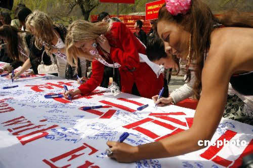 三月二十七日,來自世界一百一十五個國家和地區的的國際旅游小姐在河南云臺山簽名,祝福北京奧運成功舉辦。當日,來河南參加國際旅游小姐總決賽的各國佳麗巡游來到河南焦作云臺山世界地質公園。中新社發 慎重 攝