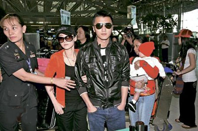 在曼谷期間,霆鋒除了拍戲便陪妻兒,更一家三口拜四面佛。他們的行蹤低調,連日來傳媒也未能“埋身”采訪。昨日霆鋒一家三口高調返港,他們在4時許抵機場,現場有警員護駕。
