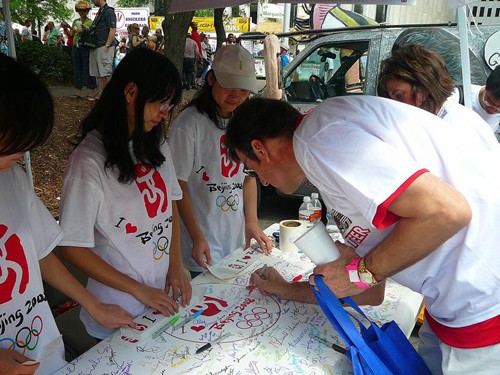 在現場擺設的“簽名支持北京奧運”攤位前,光臨這里的美國客人從開攤到收攤一直絡繹不絕。有許多美國朋友在聽留學生們講完關于“北京奧運對于中國人民的重大意義”, “北京奧運目前的籌備情況”等話題之后,當即表示,我們完全支持你們的北京舉辦這屆奧運會,我們不同意任何人提出的“抵制北京奧運”的任何理由。有幾位曾經到過北京的美國人對他們的同伴介紹說:我門去過北京的,那是一個既古老又新興的漂亮城市,在北京舉辦奧運會,絕對是本屆奧運會的最佳選擇。” 他們都十分肯定地在由中國留學生準備的簽名大橫幅上簽下了自己的名字。