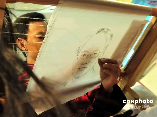 孟永國在記者會上特別創(chuàng)作了一幅特首曾蔭權(quán)的發(fā)繡畫。