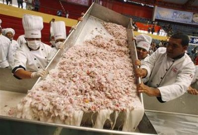 吉尼斯紀(jì)錄上目前登錄的南美風(fēng)味檸檬魚,是墨西哥在三年前所寫下,重量4.5噸;秘魯做出的這道冷盤,比墨西哥的紀(jì)錄重了兩噸多。
