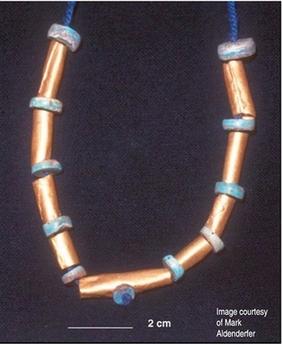 這次發現的項鏈以9顆金珠制成。這9顆珠嵌于若干個厚身圓筒中,并以一塊粗糙青石的11個圓角點綴。中央的金珠附有一塊貫穿中央一個小孔的土耳其石。