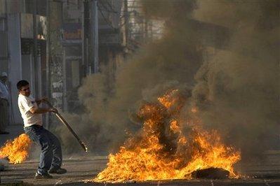 一名示威者點燃汽車輪胎。