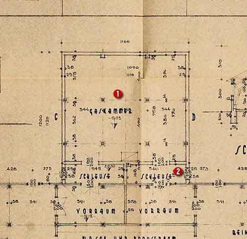 圖紙上標(biāo)有紅色符號①處即為納粹殺人用于的毒氣室,②處為隔離室,再下方為更衣室。