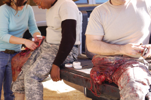 訓練現(xiàn)場一個最震撼人心的場面:軍車被炸后,“傷兵”股動脈會向外“噴血”。