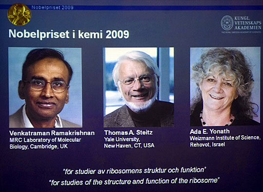 拉馬克里希南1952年出生于印度,目前持美國國籍,任職于英國劍橋MRC分子生物學實驗室;施泰茨1940年出生于美國威斯康星州,任職于美國耶魯大學和霍華休斯醫學研究所;約納特1939年出生于耶路撒冷,任職于以色列魏茨曼科學研究所。3人將平分諾貝爾化學獎獎金1000萬瑞典克朗。