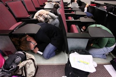 在舊金山南面的圣荷西市的科技博物館內,學生們在這里進行模擬演習。他們在晃動的車廂里,不斷落下物品的教室里,按照工作人員的口令趴下、鉆到椅子或課桌下,并設法將自己固定,一直等到搖晃停止。