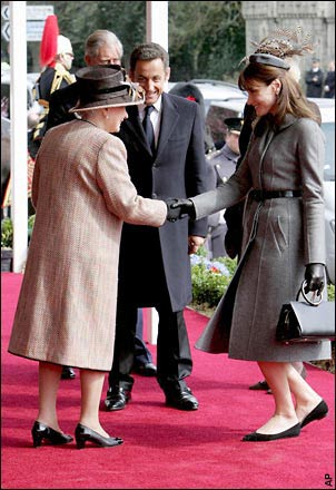 薩科齊夫婦隨后來到溫莎堡,英國女王在那里迎接他們到訪。卡拉·布呂尼向女王行屈膝禮,之前布呂尼已經(jīng)為這次見面準備了很長時間。薩科齊則在女王丈夫菲利浦親王的陪同下檢閱了英國皇家軍隊。