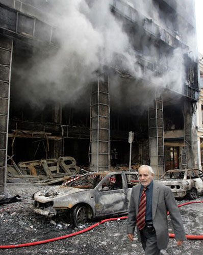 雖然政府公開呼吁各方冷靜,但在周日早間騷亂稍微平息之后,從中午開始,示威者繼續(xù)到處放火,向警察和商鋪投擲石塊,雅典市中心濃煙密布,在直升機的俯瞰下,灰蒙蒙一片。