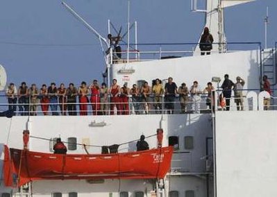 據(jù)中央電視臺(tái)報(bào)道,照片是劫持者于19日按要求讓20名船員走上甲板、供附近的美國海軍艦只拍攝的。