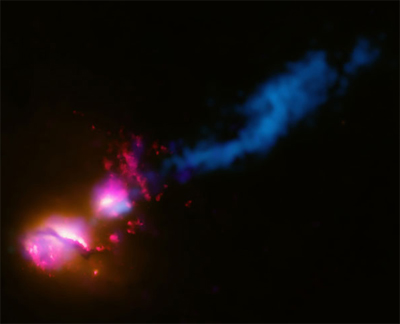 這個噴射能量的稍大一點的星系被天文學(xué)家稱為死亡星系,其中心部分的黑洞附近噴射出一股高能量粒子與磁場,噴射區(qū)寬有一千個光年,其威力之大,任何星球上的類似生命的東西都無法抵御。較小的星系被速度達光速的粒子擊中的地方顯示出亮光。