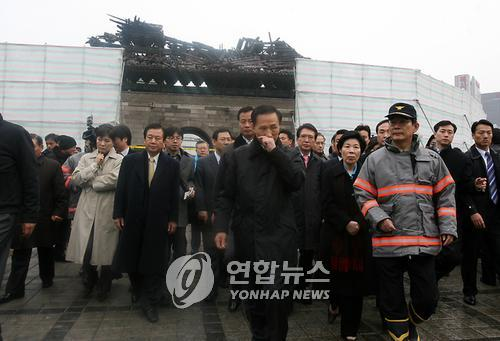 據韓聯社報道,李明博于當天上午改變原定日程,與政權接管委員會委員長李慶淑和副委員長金炯旿等人訪問了崇禮門,在視察化成灰燼的“國寶一號”火災現場期間李明博始終表情沉重,一言不發。