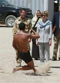 頂著大太陽觀賞新西蘭大兵演出的毛利戰(zhàn)舞,勞拉相當(dāng)愉快,不過她始終不動(dòng)如山,不像布什總統(tǒng)出訪時(shí),每逢舞蹈表演一定會(huì)共襄盛舉,從非洲、白宮到新奧爾良,當(dāng)布什遇上舞蹈團(tuán)總免不了親身參與,在中亞還要一起舞劍。布什給人的印象就好像沒出過國一樣,覺得什么都是那么的好玩。