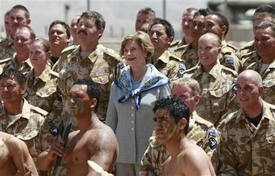 據(jù)臺(tái)灣東森新聞報(bào)道,為了歡迎第三度造訪阿富汗的美國第一夫人勞拉-布什來到新西蘭負(fù)責(zé)的重建區(qū),新西蘭士兵表演了一段毛利人的戰(zhàn)舞,一群大兵加上士官一起表演,氣勢更顯宏偉。