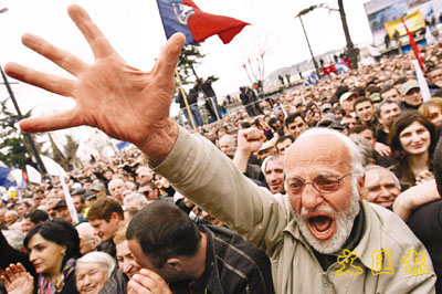 中新網4月10日電 據香港《文匯報》報道,格魯吉亞首都第比利斯9日有至少6萬人上街示威,要求總統薩卡什維利下臺。反對派領袖指摘他獨攬大權,以及違反他于2003年憑借玫瑰革命上臺時作出的改革承諾,矢言每天都會在國會外示威,直至他下臺。