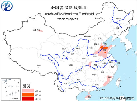 中新網6月30日電 中央氣象臺6月30日06時繼續發布高溫藍色預警:預計,今天白天,河北南部、河南東部和北部、山東大部、安徽北部、江蘇西北部、湖北西部、福建中南部的部分地區、廣東東部、海南北部等地有35~37℃的高溫。