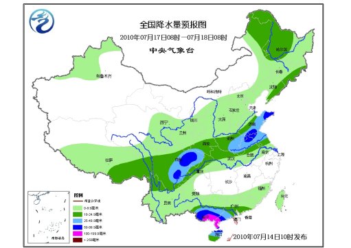 中新網7月14日電 據中央氣象臺預報,未來10天,降雨區范圍較廣,雨帶位置不穩定;江南中南部、華南北部多高溫少雨天氣;西北地區東部、華北、黃淮、東北多陣性降雨。14日,江南東北部仍將有較大降雨;之后,雨區北抬到淮河流域;江南北部將轉為高溫少雨天氣。17日前后,1002號熱帶風暴“康森”將影響華南沿海。