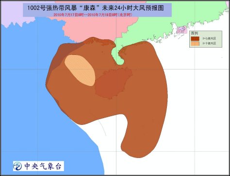 受其影響,17日白天到夜間,南海西北部、瓊州海峽、海南省及其沿海、廣東西部沿海、廣西沿海、北部灣將有7~9級大風,“康森”中心經過的附近海面的風力可達10~12級,北部灣部分海域陣風可達13~14級;廣東西南部、廣西南部、海南、云南東南部將有大到暴雨,其中海南西部、廣西南部的部分地區有大暴雨。