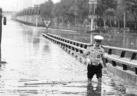 在金水路京廣鐵路立交橋下,記者看到,積水已完全淹沒(méi)地下通道,人行道和慢車(chē)道都是水,記者拿根木條試了試,水深大概1.5米。執(zhí)勤交警稱(chēng),從7時(shí)至8時(shí)30分,因積水太深,該路段交通雙向斷行1個(gè)半小時(shí),直至13時(shí),金水路金橋賓館附近交通才恢復(fù)正常。