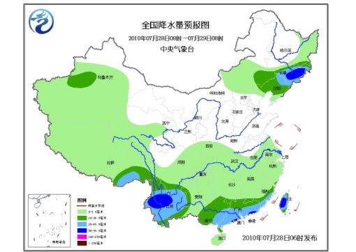 中新網7月28日電 據中央氣象臺預報,未來三天,新疆中南部、青藏高原大部、內蒙古中東部和河套地區東部、東北、華北北部、黃淮西部、江漢、江淮大部、江南、華南、西南大部有小到中雨,其中,西藏東南部、川西高原東南部、云南大部、廣西大部、廣東大部、臺灣大部、貴州東南部、湖南南部、江西中南部、福建中南部及東北南部和西北部、內蒙古中部偏南地區等地有大雨或暴雨;上述地區局地并伴有短時雷雨大風或冰雹等強對流天氣。