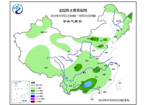 中新網7月28日電 據中央氣象臺預報,未來10天,中國主要降雨將出現在華北北部、東北、西南地區東部、東南部沿海及西藏東南部等地,降雨量一般有30-70毫米,局部地區有90-150毫米,與常年同期持平或偏多3-7成。中國其余大部分地區降雨量比常年同期偏少。