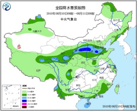 8月10日至13日,北方地區將出現一次強降雨過程。降雨主要集中在西北、華北以及黃淮的部分地區,黃河中游也將出現大雨或暴雨,局地大暴雨。甘肅舟曲11日起,也將出現較強降雨,對搶險救援不利。