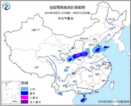 中新網8月11日電 據中央氣象臺消息,中央氣象臺8月11日18時繼續發布暴雨藍色預警:8月11日20時到8月12日20時,甘肅南部和東部、陜西中部、山西中南部、河北南部、山東中北部、四川盆地西部、廣西南部、廣東西南部、海南、云南南部等地的部分地區有大雨或暴雨,其中,甘肅東部、陜西中部、山西西南部等地的局部地區有大暴雨;上述地區局地并伴有短時雷雨大風等強對流天氣。