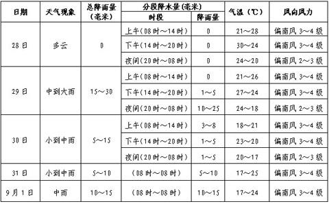 8月28日至9月1日舟曲縣精細(xì)化天氣預(yù)報(bào)如下表: