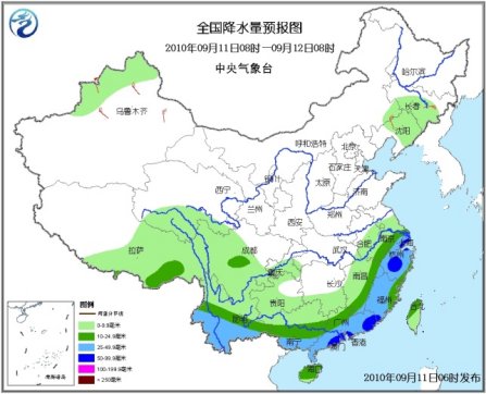 11日08時至12日08時,新疆西北部、青海南部、西藏中東部、吉林南部、遼寧中北部、江淮大部、江南中東部和南部、華南以及西南地區大部有小到中雨或陣雨,其中,江蘇東南部、上海、浙江大部、江西東北部和東南部、福建大部、廣東中南部和東部、廣西南部、云南南部等地有大雨或暴雨;上述地區局部并伴有短時雷雨大風或冰雹等強對流天氣。新疆北部、甘肅西部等地有4~6級風。黃海南部海域、東海西部和北部海域將有7~8級、陣風9~10級大風。