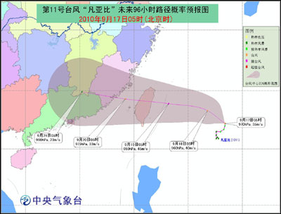 預計,“凡亞比”中心將以每小時10公里左右的速度向西偏北方向移動,逐漸向中國臺灣東部一帶沿?拷瑥姸壤^續加強,將于19日白天在這一帶沿海登陸。