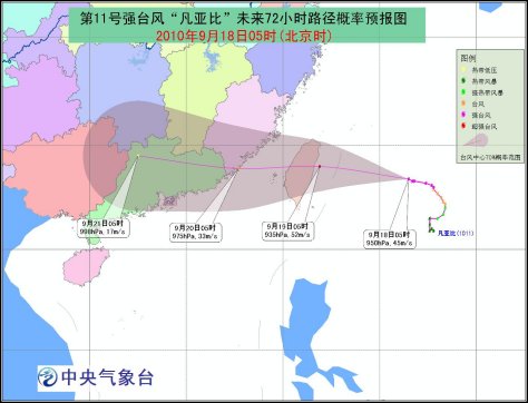 中新網9月18日電 中央氣象臺18日8時發布消息稱,今天,第11號強臺風“凡亞比”將以每小時15~20公里的速度向臺灣沿海進發,強度繼續加強,可能發展為超強臺風。受其影響,臺灣和東南沿海將遭遇狂風暴雨。中央氣象臺6時已經發布臺風紅色預警。