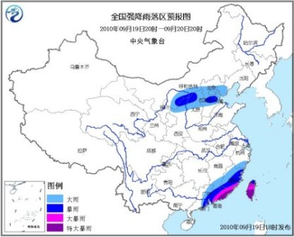 9月19日20時到20日20時,福建大部、浙江南部、江西東南部、廣東中東部、臺灣等地將有大到暴雨,福建東南部、廣東東部、臺灣等地的部分地區有大暴雨,局地有特大暴雨。