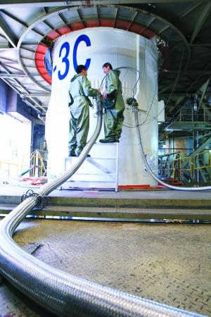 昨日,在西昌衛星發射中心,工作人員對運載火箭加注燃料,“嫦娥二號”發射進入倒計時。張雷 攝