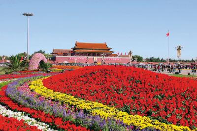 今年“十一”是共和國61歲生日,北京天安門廣場被鮮花裝扮得五彩繽紛,呈現(xiàn)一派節(jié)日氣氛。