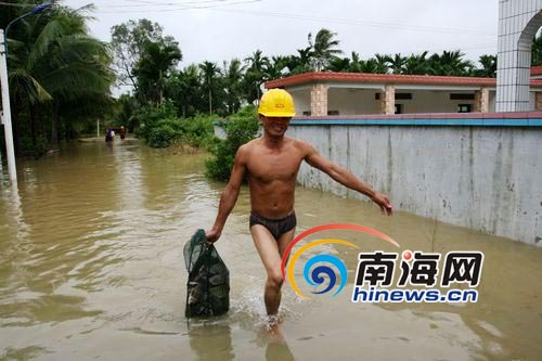 10月7日上午,瓊海市多數(shù)地區(qū)仍浸泡在洪水中,部分村民在被水圍困村莊地勢較高處“生活”,村民足不出戶可打漁。