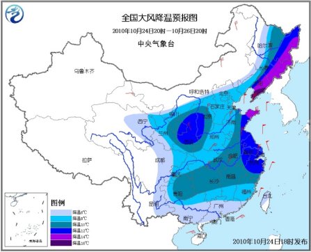 中央氣象臺今天18時繼續發布寒潮藍色預警。預計,24日20時至26日20時,西北地區東部、內蒙古南部、東北大部、華北、黃淮、江淮、江漢、江南、華南、西南地區東部等地將出現6~12℃降溫,其中,黑龍江東南部、吉林東部、遼寧東部、山東半島等地的部分地區降溫幅度可達14~16℃;甘肅大部、青海中東部、寧夏等地將有雨夾雪或小到中雪,其中,甘肅中部、青海東北部等地局地有大到暴雪。