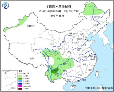 中新網10月27日電 據中央氣象臺預報,未來三天,新疆西部山區和北部、西藏東部、青海南部、甘肅南部、川西高原北部、內蒙古東北部、黑龍江北部等地有小雨(雪)或雨夾雪。陜西南部、西南地區大部、湖北西南部、湖南西北部等地有小到中雨。