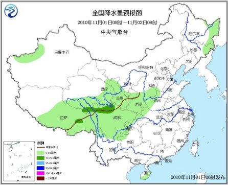 11月1日08時(shí)至2日08時(shí),新疆南疆西北部、青海南部和東部、西藏中東部、甘肅中南部、寧夏南部、川西高原北部、黑龍江東部、吉林東部等地的部分地區(qū)有小到中雨(雪)或雨夾雪,其中,西藏東北部、青海東南部、川西高原北部的局地有大到暴雪;西北地區(qū)東南部、山西南部、河南西部和北部、湖北西北部、四川大部、重慶西部和北部、云南西北部、貴州西北部以及海南大部等地有小到中雨或陣雨;內(nèi)蒙古東北部、東北等地有4~6級風(fēng);臺灣海峽、臺灣以東洋面和以南海域、南海東北部和中部海域?qū)⒂?~8級、陣風(fēng)9級的東北風(fēng),渤海將有6~7級、陣風(fēng)8級的東北風(fēng);黃海北部和中部海域?qū)⒂?~7級、陣風(fēng)8級的偏北風(fēng),黃海南部海域、東海大部海域?qū)⒂?~6級偏北風(fēng)。