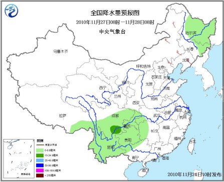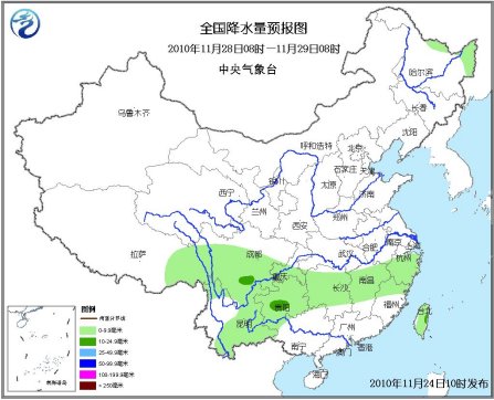 28日08時至29日08時,黑龍江東北部有小雪;江南、西南地區(qū)東部、西藏東部有小到中雨。
