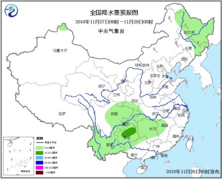 27日08時至28日08時,內蒙古東北部、黑龍江大部、吉林東部等地有小到中雪(雨)或雨夾雪,其中黑龍江中東部的部分地區有大雪;西南地區大部、陜西南部、湖北西南部、湖南、江西西部、廣西北部等地有小雨或陣雨,貴州北部有中雨。內蒙古中東部、華北東部、東北、黃淮東部等地有4~6級風。黃海中北部有6~7級、陣風8~9級的西北風;臺灣海峽、臺灣以東洋面和以南海域、南海大部有5~7級東北風。