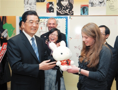 胡錦濤也選擇了一所中學參觀——芝加哥佩頓中學,并向中文班學生贈送新春禮物,一個白兔玩偶。在中美發表的聯合聲明中,雙方重申致力于建設二十一世紀積極合作全面的中美關系。