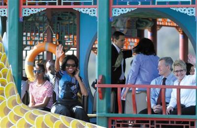 不過(guò),米歇爾昨日并未去游覽佛香閣,而是乘船游覽昆明湖。陪同她游覽的還有美國(guó)大使夫婦。在船上,身著藍(lán)色上裝、黑色褲子的米歇爾面帶笑容,不時(shí)向岸邊圍觀的游客揮手致意。