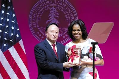 而在兩年前的北大斯坦福中心揭牌儀式上,北大向斯坦福大學(xué)贈(zèng)送的禮物是《中華文明史》叢書(shū)的中文版,斯坦福大學(xué)則向北京大學(xué)贈(zèng)送了北大斯坦福中心正門的石雕。