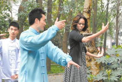 米歇爾說,其實(shí)在美國(guó)很多中學(xué)生都知道太極拳,她回國(guó)之后也會(huì)建議兩個(gè)女兒去學(xué)習(xí)太極。這是一種很神奇的運(yùn)動(dòng)。葉子說,她很幸運(yùn),跟米歇爾交流了好一陣子,她告訴米歇爾她曾經(jīng)去過美國(guó)交流,她很喜歡美國(guó)的學(xué)校!拔覀兺τ泄餐Z言的!”葉子說。