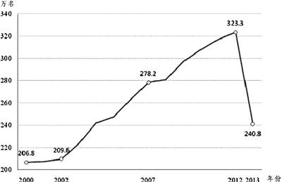 中組部昨日公布的統計圖表顯示,近年來,中共發展黨員數量一直呈上升趨勢。2004年,中共發展的黨員數量達到241.8萬人,此后歷年發展黨員的人數一直也在逐年攀升,直到2012年新發展黨員的數量達到歷史峰值的323.3萬名。不過,和之前十年發展黨員的數量一路攀升形成對比的是,2013年中共發展黨員的數量為240.8萬名,較上年減少82.5萬名,降幅為25.5%,240.8萬名的數量同時也創下近十年來發展黨員數量的最低。