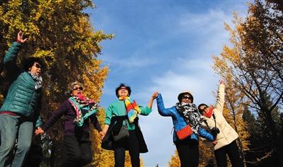 11月10日,地壇公園,游客在藍天下合影。 拍者 王彥高 攝