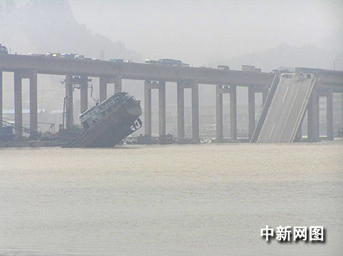 資料圖:廣東南海九江大橋懷遭一艘運砂船撞擊橋墩,約有100多米橋面墮入江中。