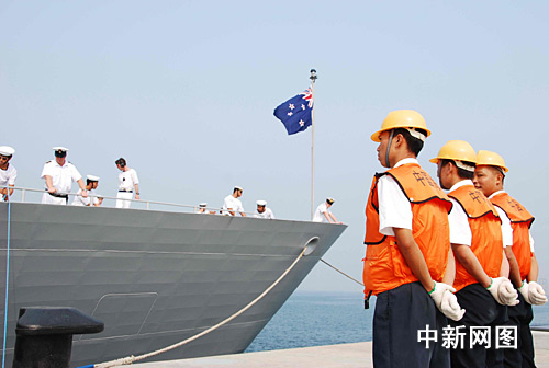 中國海軍在碼頭上舉行了熱情的歡迎儀式。軍樂隊高奏迎賓曲。數百名水兵列隊迎接,與新西蘭軍艦站坡官兵隔水相望,互至注目禮。兩名中國海軍女戰士向走下舷梯的大衛•安森準將和格蘭特艦長敬獻了鮮花。南海艦隊副參謀長么志樓將軍與大衛•安森準將握手,對新西蘭軍艦到訪南海艦隊表示歡迎。
