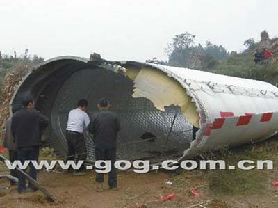 昨日,記者在主體殘骸墜落地現場看到:一個像中巴車般大小的圓柱體橫躺在已收割的包谷地里,由于殘骸墜落時巨大的沖擊力,圓柱體已略變橢圓,但仍較為完整,一個鐵架子的幾支腳已鉆進了泥土里,還有一個像大塑料長管子的物件墜落在一姓吳的農家房屋中堂,并將該堂屋擊壞。