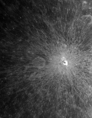 月球背面一個典型的輻射線撞擊坑。本圖是由5軌CCD正視影像數據拼接而成的,數據獲取時間為2007年12月4日。圖片來源:國家航天局